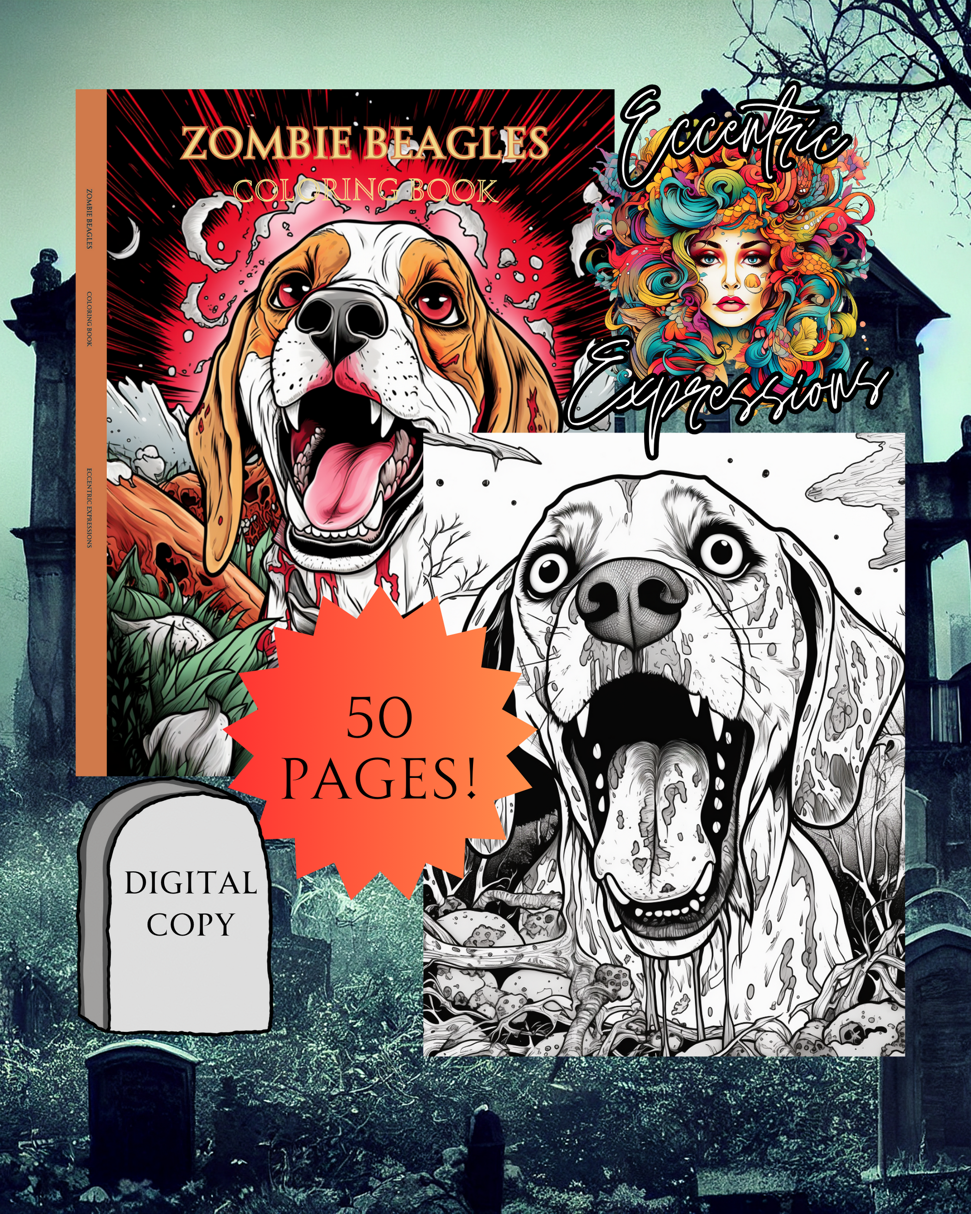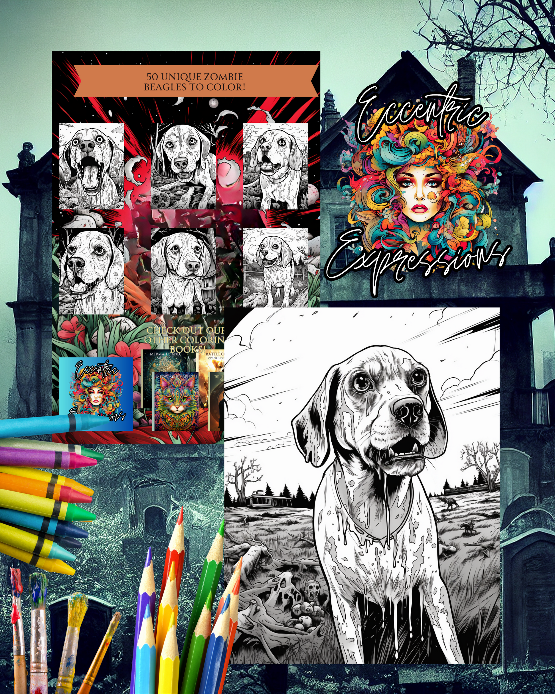 Discover Zombie Beagles, an adult coloring book combining the beloved breed with the undead. Within its pages is a diversity of zombie Beagles, each with captivating and terrifying traits from decaying fur to glowing yellow eyes. Unleash your artistic skills and create unique pieces with muted hues or bold shades. Perfect for dog lovers, Halloween fans, or anyone looking for a distinctive coloring experience, Zombie Beagles invites you to a realm of cuteness and horror. Embark on a journey merging Beagles and the undead and bring these ghoulish hounds back to life in unexpected ways. Color outside the lines and let your imagination run with Zombie Beagles!